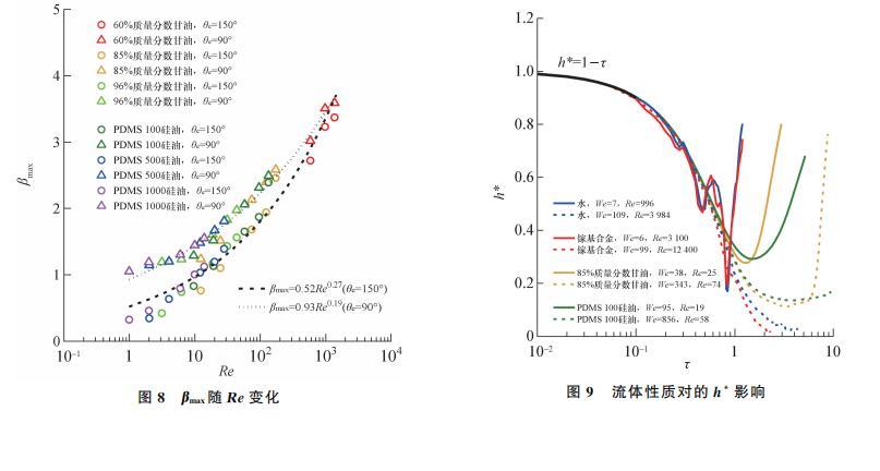 4)對于以往鮮有研究的高黏度PDMS1000硅油和超高表面張力的鎵基合金,盡管這2種流體物性較為特殊,但其碰撞過程仍主要受Re和We影響。但當PDMS1000硅油以低速碰撞壁面時,Re接近于1,此時液滴的入射動能很快通過黏性力耗散殆盡,慣性力作用可忽略不計,液滴在壁面上近似于自發(fā)鋪展,導致βmax和hmin*主要由液滴初始動能和壁面潤濕性決定,偏離結論2和3中與We、Re之間的冪函數(shù)關系。