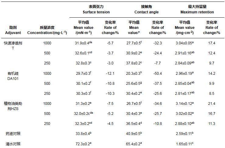 2.1添加噴霧助劑后藥液理化性質(表面張力、葉面接觸角)的變化