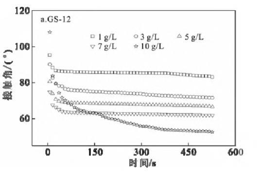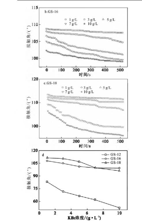 在KBr濃度區間1~10 g/L內,GS-12隨著KBr濃度的增加,接觸角顯著減小,而GS-16和GS-18則變化不明顯。可以解釋為:對于GS-12而言,KBr濃度越高,固/液界面處的填料越緊密,導致氣/液固界面張力值降低,而疏水鏈較長的GS-16和GS-18其自身降低界面張力的能力有限,所以,隨KBr濃度增加,接觸角變化有限[1,19]。此外,隨著KBr濃度的增加,液滴在石蠟膜上的接觸角值減小。