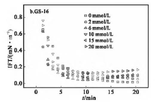 表面活性劑/油體系的動態界面張力行為,對驅油過程具有重要意義。動態界面張力是驅油過程中各種復雜物理化學反應的具體體現。因此,研究動態界面增長力及其影響因素非常重要。溶液中離子強度增加,將影響表面活性劑分子在水相中的溶解度,改變雙電層參量,而導致油水界面表面活性劑濃度的改變。一般情況下,添加的鹽可以通過中和表面活性劑分子在界面上頭基的電荷來減弱表面活性劑分子之間的靜電斥力,導致IFT降低[5]。溫度為30℃下,不同KBr鹽濃度下,GS-12,GS-16的煤油/表面活性劑溶液界面張力隨時間的變化曲線見圖6。
