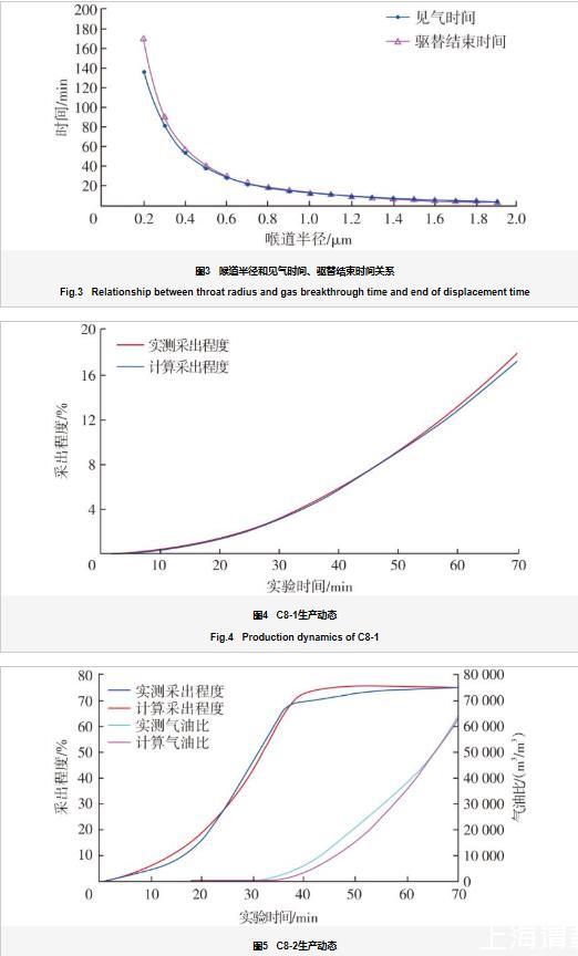 以時間為節(jié)點,運用節(jié)點分析法計算任一驅(qū)替時刻前緣位置以及見氣時間和驅(qū)替結(jié)束時間(圖3)。選擇時間步長為2 s,從驅(qū)替開始起算,在2 s的時間里部分CO2開始進(jìn)入喉道內(nèi)部的同時導(dǎo)致驅(qū)替壓差發(fā)生變化,進(jìn)一步導(dǎo)致CO2-原油體系的界面張力以及原油黏度發(fā)生改變。因此,將驅(qū)替進(jìn)行2 s后的實際驅(qū)替壓差以及對應(yīng)的界面張力、黏度等參數(shù)代入第2個時間步參與計算,依次迭代,直至CO2驅(qū)過程結(jié)束。運用該方法,結(jié)合喉道大小及分布頻率特征計算得到C8-1和C8-2巖心并聯(lián)CO2驅(qū)替全過程生產(chǎn)動態(tài)(圖4、圖5)。由圖3可知:見氣時間與驅(qū)替結(jié)束時間隨喉道半徑的增大而縮短,且喉道越大縮短幅度越小。喉道半徑越大,驅(qū)替結(jié)束時間與見氣時間的差值越小,可以推斷物性較好的油藏見氣后氣油比上升較快。