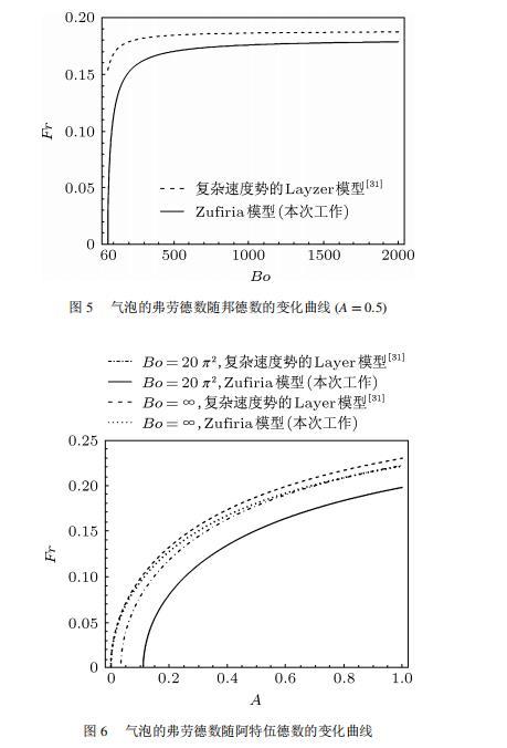 當(dāng)取邦德數(shù)一定時,氣泡的弗勞德數(shù)隨阿特伍德數(shù)的變化如圖3所示。在圖3中Bo=20pi^2。從圖中可以發(fā)現(xiàn),利用Goncharov所提出的復(fù)雜速度勢運算的結(jié)果比本次工作稍微大一些。在阿特伍德數(shù)等于1時,兩種理論結(jié)果完全一致。當(dāng)阿特伍德數(shù)較小時,兩種理論結(jié)果也基本一致。