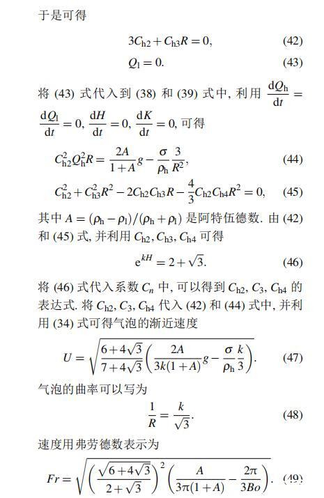 將具有簡單速度勢的Layzer模型和Zufiria模型推廣至非理想流體情況,并分別利用這兩種模型研究了界面張力對Rayleigh-Taylor不穩(wěn)定性的影響。首先得到了兩種模型下氣泡的漸近速度和漸近曲率的解析表達(dá)式;其次系統(tǒng)研究了界面張力對氣泡的漸近速度和漸近曲率的影響;最后將兩種模型進(jìn)行了比較,并將氣泡的漸近速度和數(shù)值模擬進(jìn)行了比較。研究表明:界面張力壓低了氣泡的速度,但對曲率沒有影響;利用簡單速度勢的Layzer模型所得的氣泡的漸近速度比復(fù)雜速度勢的Layzer模型的值小,但是比Zufiria模型的值大;當(dāng)阿特伍德數(shù)等于1時,簡單速度勢的Layzer模型和復(fù)雜速度勢的Layzer模型給出的結(jié)果一致。