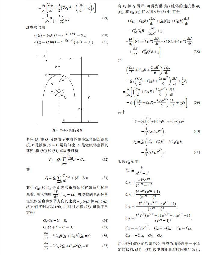 Layzer模型和Zufiria模型都是建立在理想流體之上。然而對實際流體而言,很多因素都可以影響RT不穩(wěn)定性的演化情況,如密度比、黏性、界面張力、壓縮性、外場加速度、Kelvin-Helmholtz不穩(wěn)定性等。Young和Sohn利用Goncharov提出的復(fù)雜速度勢,將Layzer模型推廣并應(yīng)用到非理想流體中,研究了界面張力對RT不穩(wěn)定性增長的影響,發(fā)現(xiàn)界面張力降低了氣泡的增長速率。2011年本文的作者之一利用Zufiria模型研究了黏性對RT不穩(wěn)定性增長的影響。但是,目前沒有人利用Sohn提出的簡單速度勢的Layzer模型研究界面張力對RT不穩(wěn)定性的影響,也沒有人利用Zufiria模型研究界面張力對RT不穩(wěn)定性的影響。