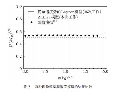 最后,我們將兩種理論模型的結(jié)果與數(shù)值模擬進(jìn)行了比較,如圖7所示。在誤差允許的范圍內(nèi),Zufiria模型和Layzer模型與數(shù)值模擬符合的都很好。由簡單速度勢的Layzer模型得出的結(jié)果更接近于數(shù)值模擬。另外,從圖7中還可以看出,簡單速度勢的Layzer模型計算值比數(shù)值模擬結(jié)果高,而Zufiria模型比數(shù)值模擬低。這可能由于Zufiria模型假設(shè)速度勢是復(fù)數(shù)勢,會人為引進(jìn)速度的耗散,導(dǎo)致結(jié)果比數(shù)值模擬低,而Layzer模型的計算值略高于數(shù)值模擬的原因可能由于數(shù)值模擬沒有達(dá)到漸近速度。