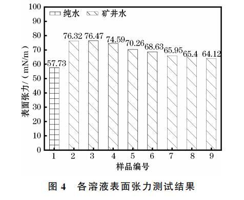 液體從噴嘴噴出初始階段,表面張力會對射流霧化產生阻礙作用,所以表面張力對噴霧場霧化性能有重要影響。測量表面張力時,調節樣品臺和光源在同一高度,在進樣器中裝入1mL待測礦井水后滴至測量臺,待測溶液與測量臺接觸瞬間,開始捕捉液滴形態。測量完畢后,利用數據處理系統處理試驗數據與圖像。