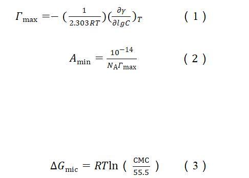 根據(jù)表面張力和濃度的關(guān)系曲線,使用吉布斯吸附等溫線〔方程(1)〕計算出表面活性劑分子吸附在氣液界面的最大表面過剩濃度(Гmax)。
