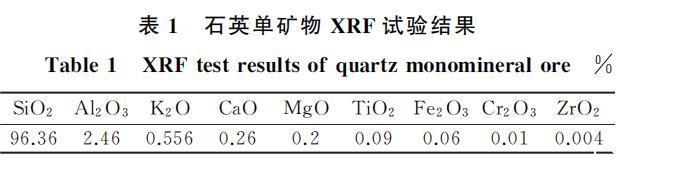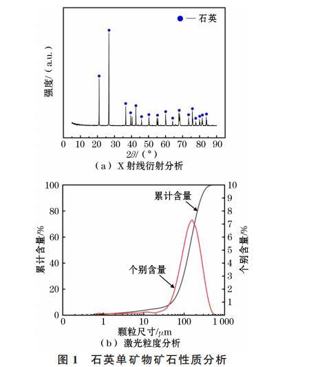本試驗所用的單礦物石英取自某礦廠,將制備后的石英單礦物樣品進(jìn)行X射線衍射(XRD)分析、X射線熒光光譜(XRF)分析和激光粒度分析,XRD的分析結(jié)果如圖1(a)所示,XRF的分析結(jié)果見表1,粒度分析如圖1(b)所示。從圖1(a)可以看出,石英單礦物SiO?峰強度以及密度最高,說明SiO?占主導(dǎo)地位。從圖1(b)可以看出,樣品的中值粒徑D??達(dá)到了133.5μm,D??則達(dá)到了264.3μm.綜合上述礦物的純度以及粒度,石英可滿足后續(xù)單礦物試驗以及機理分析的要求。