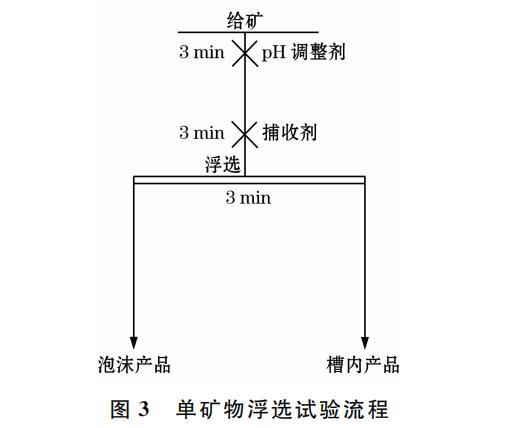 采用一次粗選的試驗流程,探究十二胺(DDA)和YTDB在不同礦漿pH、不同捕收劑用量下,對石英以及赤鐵礦回收率的影響。單礦物浮選試驗在XFD-Ⅲ浮選機進(jìn)行,在室溫條件下配制礦漿,稱取2.00 g的單礦物放入浮選槽中,再加入20 g去離子水,控制浮選機的攪拌速度為1900 r/min,攪拌2 min以充分?jǐn)噭虻V漿。加入事先準(zhǔn)備好的pH調(diào)整劑調(diào)漿3 min,再加入捕收劑調(diào)漿3 min后,開始刮泡,控制刮泡時間為3 min.浮選結(jié)束后,將精礦進(jìn)行過濾、烘干、稱重,隨后計算其回收率。單礦物浮選試驗流程如圖3所示。