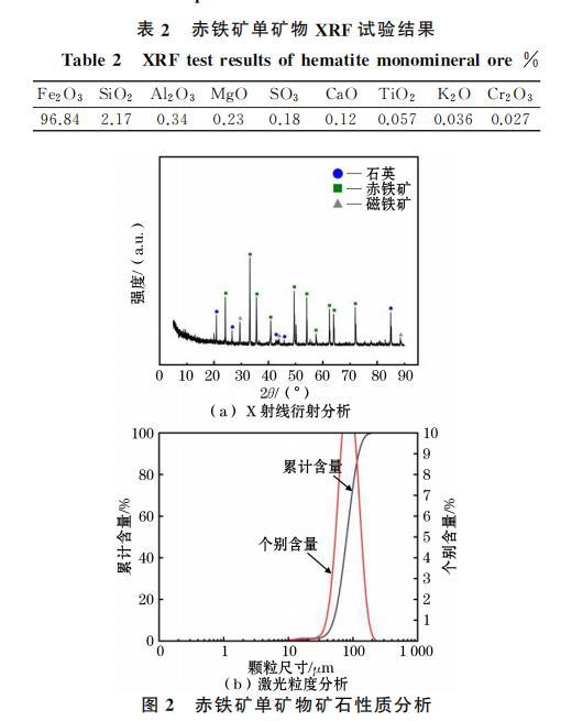 赤鐵礦單礦物則取自某鐵礦廠,將制備后的赤鐵礦樣品進(jìn)行X射線衍射(XRD)分析、X射線熒光光譜(XRF)分析和激光粒度分析,XRD的分析結(jié)果如圖2(a)所示,XRF的分析結(jié)果見表2,粒度分析如圖2(b)所示。從圖2(a)和表2可以看出,F(xiàn)e?O?峰強度最高,含量達(dá)到了96.84%,另外含有少量的氧化物SiO?、Al?O?等。從圖2(b)可以看出,樣品的中值粒徑D??達(dá)到了79.89μm,D??則達(dá)到了123.2μm.綜合上述純度以及粒度,赤鐵礦可滿足后續(xù)單礦物試驗的要求。