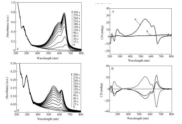 以CODA為例,隨著紫外光輻照時間增加,LB膜在590和640nm處出現(xiàn)2個典型的聚二乙炔藍(lán)相吸收峰,且隨時間增加而逐漸增強(qiáng),薄膜顏色由淡黃色變?yōu)樗{(lán)色。而對于CO2DA LB膜,隨著254nm紫外光輻照時間的增加,在540和620nm處出現(xiàn)兩個明顯的吸收峰,分別對應(yīng)于聚二乙炔紅相和藍(lán)相的典型吸收,薄膜顏色由淡黃色變?yōu)樽仙kS著輻照時間的增加,540nm處吸收峰明顯增強(qiáng),聚合薄膜中聚二乙炔紅相組分變多。
