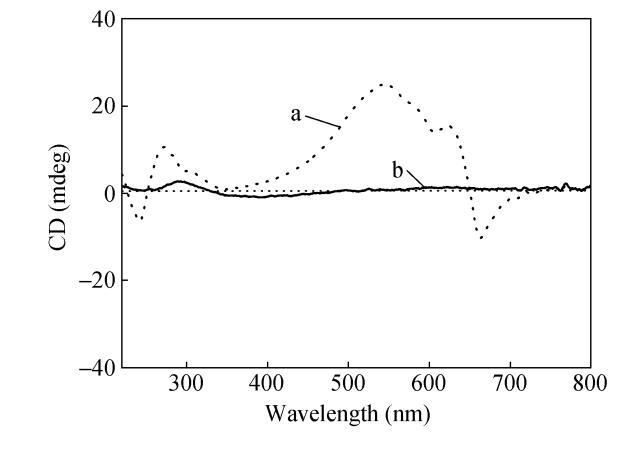 香豆素基團(tuán)在紫外光照條件下可發(fā)生可逆的光二聚反應(yīng):在365nm光輻照下,香豆素基團(tuán)能發(fā)生光二聚反應(yīng),在254nm輻照下香豆素二聚體能可逆地發(fā)生解二聚反應(yīng)。可以預(yù)見香豆素端基的二聚化將影響香豆素取代二乙炔單體在氣液界面的組裝,從而影響聚二乙炔主鏈螺旋結(jié)構(gòu)的形成。我們用365nm紫外燈輻照CODA氯仿溶液20min,此時香豆素端基能發(fā)生二聚,而二乙炔基團(tuán)不會發(fā)生聚合。將得到的CODA二聚體的氯仿溶液鋪展在水面上,沉積制備LB膜,制備得到的CODA二聚體LB膜能聚合成藍(lán)相。CD光譜測試發(fā)現(xiàn)香豆素基團(tuán)和相應(yīng)的聚二乙炔吸收帶均出現(xiàn)了明顯的CD信號,但強(qiáng)度較CODA LB膜均有所減弱,如圖8所示。