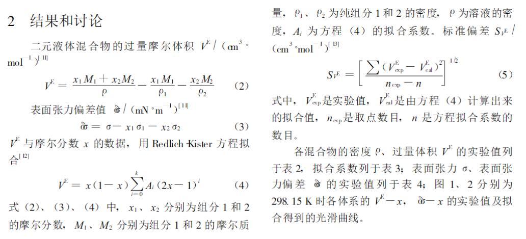式 (2)、 (3)、 (4)中, x1、 x2分別為組分1 和2的摩爾分數(shù), M1、 M2分別為組分1 和2 的摩爾質量, ρ1、 ρ2為純組分1 和2 的密度, ρ為溶液的密度, Ai為方程 (4)的擬合系數(shù)。標準偏差 SVE(cm3·mol-1)[ 13]