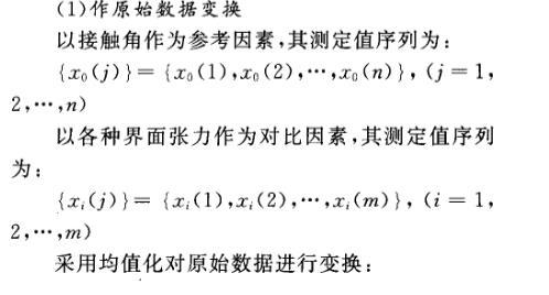 灰色關聯分析是通過對統計序列幾何關系的比較來分清系統中多因素間的關聯程度,序列曲線的幾何形態越接近,則它們之間的關聯度越大。油水、水固、油固界面張力對接觸角影響程度的灰色關聯分析步驟如下。