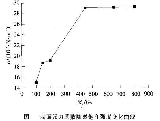 由圖7可知,α與Ms有關。Ms小于120Gs時,α與Ms成正比;大于120Gs小于200Gs時,α緩慢增加;大于200Gs小于440Gs時,成線性增加;大于440Gs時,基本恒定。這種變化規律主要是由于不同磁飽和強度的磁性液體所含磁性顆粒的數目不同所致。