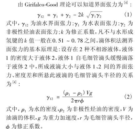 式中,γ??為油水界面張力;γ?為水表面張力;γ?為非極性烴油表面張力;k為修正系數(shù),水不與水形成氫鍵的k值一般在0.51~0.78之間。滴體積法測界面張力的基本原理是:設(shè)存在2種不相溶液體,液體1的密度大于液體2,液體1自毛細管滴頭緩慢滴落于液體2中,所成液滴大小與液體1、2間的界面張力、密度差和所懸此液滴的毛細管滴頭半徑的關(guān)系為:
