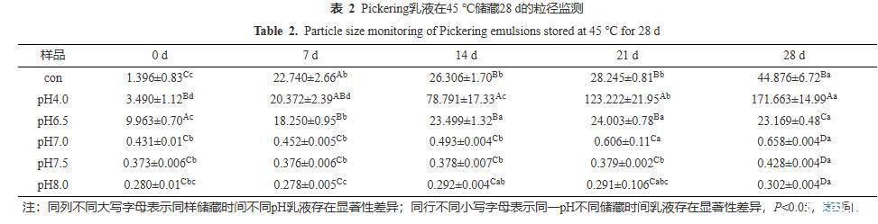 此類結構特性增強了顆粒在界面的粘彈性膜形成能力,從而提升乳化效率。表觀粘度和乳液穩定性實驗表明,pH6.5制備的Pickering乳液在中短期內具有顯著穩定性優勢,其表觀粘度最高,液滴粒徑分布集中,且在45℃加速儲存14 d后仍保持均勻。盡管中性/堿性條件(pH7.0~8.0)的乳液在長期儲存(28 d)中表現更優(TSI值最低),但其較小的顆粒尺寸(0.28~0.43μm)可能需更高能量輸入以實現快速乳化。因此,pH6.5在加工效率與穩定性之間取得了平衡,尤其適用于肉制品等需即時乳化的場景。綜上所述,pH6.5條件下制備的PPP-NP憑借均一的納米結構、快速界面吸附及中短期穩定性,為更優異的食品乳化劑的開發提供了新思路,并為接下來設計一種更有效的活性物質遞送系統提供了新的策略和理論基礎。