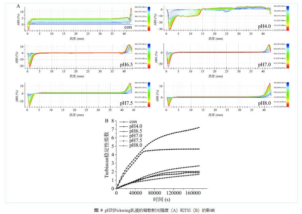 作為穩定性研究的一部分,在45℃連續測量48 h的乳液光散射衍射。這些測量可用于評估乳液短期或長期穩定性,并闡明不穩定機制。圖9A顯示了在不同pH條件下PPP-NP穩定的Pickering乳液ΔBS的演變。乳液穩定性的定義表明,如果液滴的數量、尺寸分布和空間分布不隨時間變化,則乳液是穩定的。而BS則可直觀反映乳化體系整體或局部的不穩定現象。因此,乳液越穩定,觀察到的BS變化就越小。