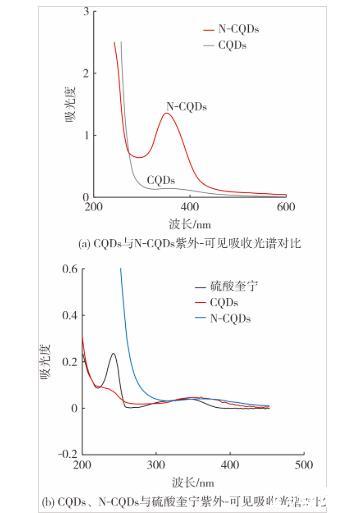 圖4(a)是CQDs與N-CQDs的紫外-可見吸收光譜。與CQDs的吸收光譜相比,N-CQDs在波長為350 nm處有一個明顯的吸收峰,這是酰胺基團中的C=O的n→π躍遷所致,在長波段方向出現吸收帶。這也表明氮原子已被成功引入碳量子點中。圖4(b)是以參比法計算熒光量子產率CQDs和N-CQDs以及硫酸奎寧的紫外吸收光譜對比,從圖4(b)可以看出,三者吸光度在波長為300~400 nm區間內基本接近,且數值上沒有超過0.05,滿足量子產率計算條件要求,可以此濃度為基礎計算熒光量子產率。