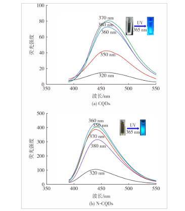 圖5 CQDs和N-CQDs在不同激發波長下的熒光發射光譜