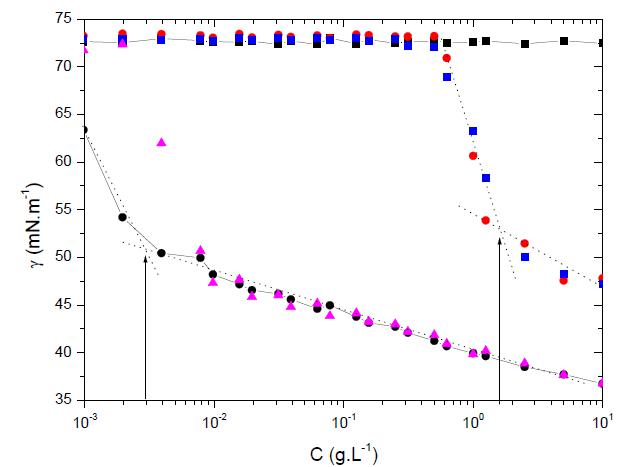 微流控技術(shù)是一種利用微米尺度管道及其它輔助手段對(duì)納升、皮升級(jí)流體單元進(jìn)行主、被動(dòng)操縱的新興技術(shù)。近年來,Karakasyan研究團(tuán)隊(duì)?wèi)?yīng)用微液滴微流控技術(shù)制備出單分散響應(yīng)型的聚醚胺-海藻酸鹽共聚的微凝膠(Colloids and Surfaces B:Biointerfaces,2015,135,619–629),聚醚胺(PEA)與環(huán)氧丙烷/環(huán)氧乙烷(29/6)通過兩種分子之間的胺鍵相連接枝共聚得到海藻酸鹽接枝型的微凝膠。液滴微流控技術(shù)為海藻酸鹽接枝微凝膠提供了精準(zhǔn)的尺寸和物理化學(xué)性質(zhì)控制,使得這些微凝膠與單獨(dú)的海藻酸接枝鏈比,仍然保持有兩親型和熱敏性等性質(zhì),應(yīng)用表面張力測(cè)試技術(shù)研究微凝膠的表面化學(xué)性質(zhì),通過使用Delta-8高通量表面張力分析儀,采用Du Nouy-Padday法(最大拉力法)測(cè)試了不同濃度比例的組成聚醚胺-海藻酸鹽共聚物化合物的表面張力,并自動(dòng)將表面張力記錄到系統(tǒng)中,由于Delta-8高通量表面張力儀能夠一次性測(cè)試96個(gè)樣品,軟件對(duì)測(cè)試的樣品的數(shù)據(jù)能夠進(jìn)行自動(dòng)分析,從而獲得了聚醚胺-海藻酸鹽共聚物的臨界聚集濃度(CAC)以及臨界膠束濃度(CMC)。(如下圖1所示)。