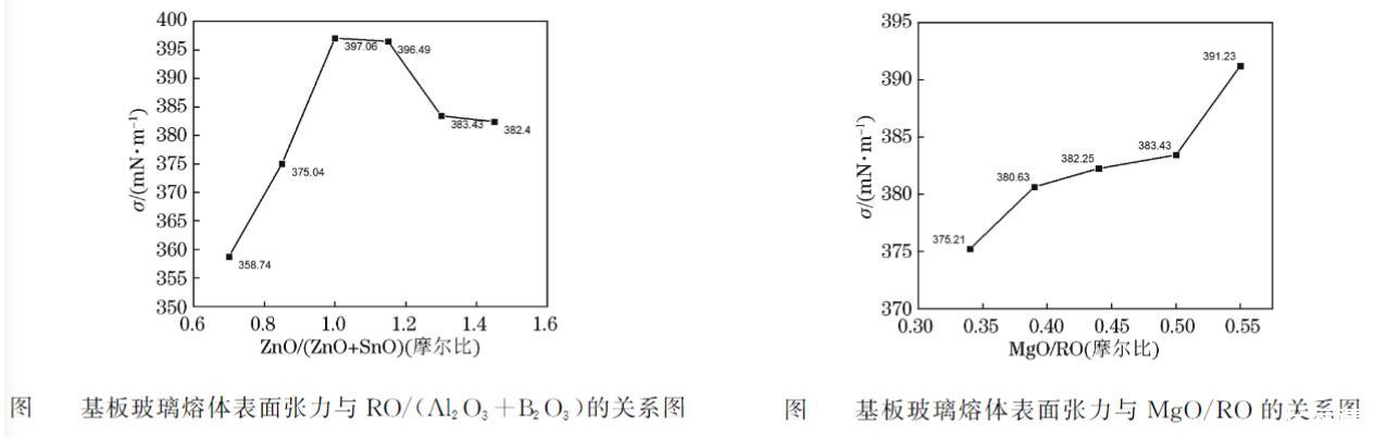 圖 5 基板玻璃熔體表面張力與 RO/(Al?O?+B?O?) 的關(guān)系圖