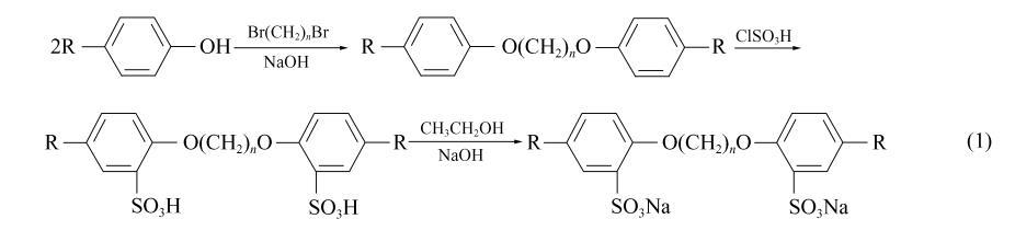 式(1)中,疏水基 R基團為 (CH3)3CCH2C(CH3)2 ;聯結基為 -O(CH2)nO-n 為2,4,6,8。所得產物記為 D2Cn 系列。