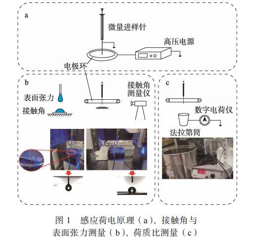 圖1 感應(yīng)荷電原理(a)、接觸角與表面張力測(cè)量(b)、荷質(zhì)比測(cè)量(c)