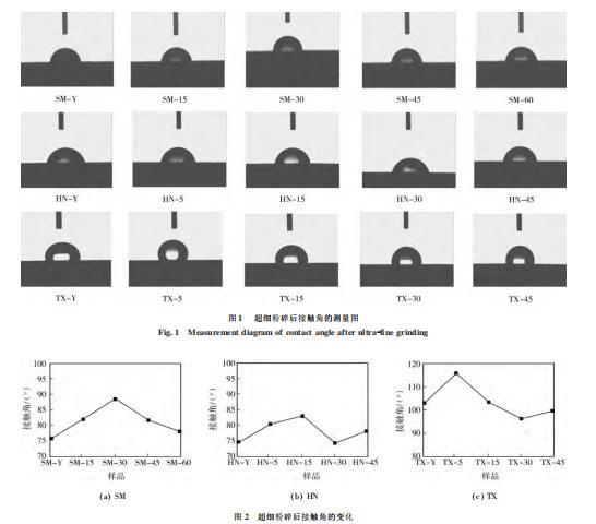 圖2超細(xì)粉碎后接觸角的變化(使用Delta-8表面張力儀測得)