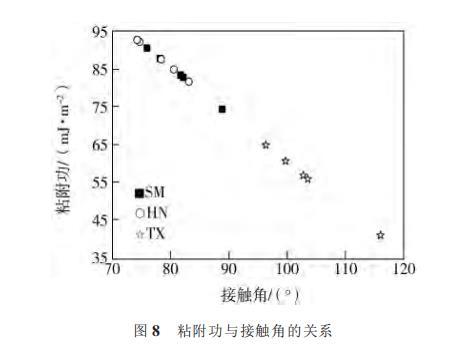 圖8粘附功與接觸角的關(guān)系