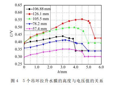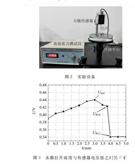 圖2是WBM-1A拉脫法液體表面張力實驗儀,用來測定純凈水的表面張力系數。實驗時采用標準吊環的內、外徑分別為d1=33.10 mm,d2=34.96 mm,平均直徑為d?=34.03 mm,平均周長為πd?=106.88 mm。該標準環拉出的水膜高度與力敏傳感器電壓讀數之間的關系,如圖3所示??梢钥闯?,隨著水膜高度的增加,吊環拉力逐漸增加到最大(圖中Umax表示),然后慢慢減小,直至水膜斷裂。圖中U斷前和U斷后分別表示水膜斷裂時和斷裂后的瞬時電壓值。吊環的受力變化情況與之前理論分析一致。