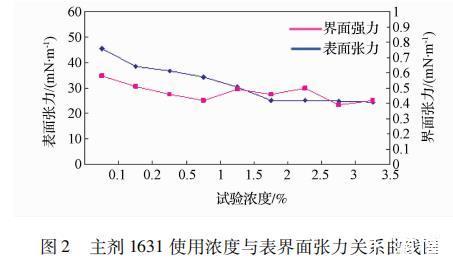 圖2 主劑1631使用濃度與表界面張力關系曲線圖