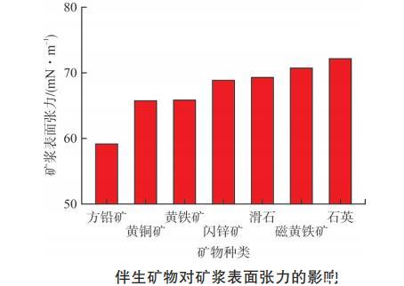 對礦漿濃度為 30%的黃銅礦、方鉛礦、滑石、閃鋅礦及石英的礦漿表面張力進行了測定。在 pH=7、粒度-0.074 mm占比 80%的條件下,考察了黃鐵礦與磁黃鐵礦及伴生礦物質量比為 7∶3時,不同伴生礦物對礦漿表面張力的影響,。結果發現:不同礦物的礦漿表面張力存在差異,具體為石英 72.17 mN/m、磁黃鐵礦 70.72 mN/m、滑石 69.31 mN/m、閃鋅礦 68.88 mN/m、黃鐵礦 65.89 mN/m、黃銅礦 65.72 mN/m、方鉛礦 59.14 mN/m。分析結果表明,方鉛礦的礦漿表面張力最低,而石英的礦漿表面張力與水的表面張力(72.80 mN/m)最為接近。