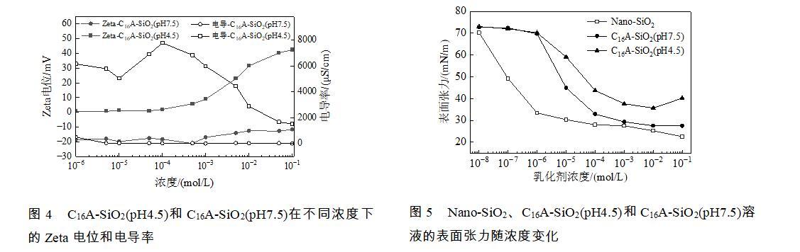 圖4 C16A-SiO2(pH4.5)和C16A-SiO2(pH7.5)在不同濃度下的Zeta電位和電導(dǎo)率