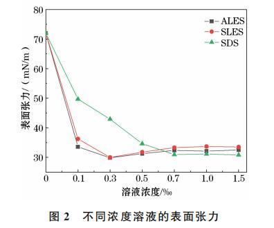 選取十二烷基聚氧乙烯醚硫酸銨(ALES)、十二烷基聚氧乙烯醚硫酸鈉(SLES)和十二烷基硫酸鈉(SDS)3種表面活性劑,進行表面張力的測試。測試過程中,通過調節芬蘭Kibron公司生產的Delta-8全自動高通量表面張力儀將鉑環緩慢浸入溶液中,然后緩慢提起鉑環,當鉑環與液體樣品分離時進行測量,并記錄表面張力,每種溶液測量3次。每次測量前,用無離子水(IFW)清洗鉑環并在酒精燈上干燥。