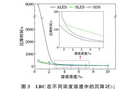 將30 mL表面活性劑溶液(ALES、SLES和SDS)加入透明塑料杯中,隨后將50 mg煤粉通過玻璃漏斗自然滑落至定性濾紙上。通過調節移動支架,使裝有煤塵的濾紙緩慢下降,當濾紙浸入溶液時,很快與煤塵分離并沉入溶液中。沉降時間是指從定性濾紙與煤樣分離到所有煤樣完全浸入溶液所需的時間。用煤粉的沉降時間來表征不同表面活性劑溶液潤濕煤塵的能力。每種溶液測試3次,并取測試結果的平均值。