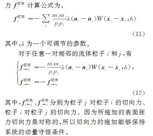 傳統的流體表面張力的求解只是對色標函數求梯度,表面張力的方向就是色標函數的梯度方向,也就是說傳統的流體表面張力的方向和表面法向相同;傳統的流體表面張力模擬將表面的法向力作為表面張力,由于近似計算導致的計算誤差使得流體表面張力的模擬很難到達自然界中的平滑狀態,會出現凹凸不平,甚至尖角的模擬效果。本文在傳統的CSF流體表面張力的基礎上,考慮流體表面的法向力和切向力的綜合作用,使得流體表面達到足夠光滑。流體表面張力的切向力f切向i計算公式為:f切向i=-∑j mimj ρiρj λ( ni- nj) W( xi- xj, h) (11)其中,λ為一個可調節的參數。對于任意一對相鄰的流體粒子i和j,有f切向i← j=- mimj ρiρj λ( ni- nj) W( xi- xj, h), f切向j← i=- f切向 i← j ì ? í ?? ?? (12)其中,f切向i← j、f切向 j← i分別為粒子j對粒子i的切向力、粒子i對粒子j的切向力。因為所施加的表面張力切向力是對稱的,所以切向力的施加能夠保持系統的動量守恒條件。