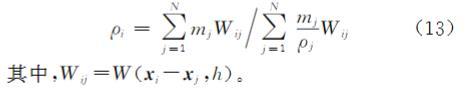 針對CSF流體表面張力模型中流體表面的粒子數目較少,流體表面的流體粒子密度求和的邊界截斷誤差較大,進而導致流體表面張力模擬不穩定的問題,本文對邊界粒子的密度進行修正,計算公式為:ρi=∑ N j=1 mjWij∑ N j=1 mj ρj Wij(13)其中,Wij= W( xi- xj, h)。