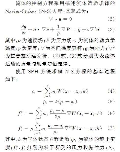 流體的控制方程采用描述流體運動規律的NavierGStokes(NGS)方程,其形式為:?·u=0(2) ? u ? t+u·? u+1 ρ? P= g+ ν?2 u(3)其中,u為速度場;P為壓力場;ν為流體的動力學黏度;ρ為密度;?為空間梯度算符;g為外力;?2為拉普拉斯運算符。(2)式、(3)式分別代表流體運動的質量與動量守恒定律。使用SPH方法求解NGS方程的基本過程如下:ρi=∑ N j=1 mjW(xi-xj, h)(4) pi= k( ρi- ρ0)(5) f p i=-∑ N j=1 mj pi+ pj 2 ρj ? W(xi-xj, h)(6) f ν i= μ∑ N j=1 mj uj- ui ρj ?2 W(xi-xj, h)(7)其中,k為氣體狀態方程常數;ρ0為流體的靜止密度;f p i、f ν i分別為粒子所受的壓力和黏性力;pi、pj分別為第i個、第j個粒子的壓強;ui、 uj分別為第i個、第j個粒子的速度。