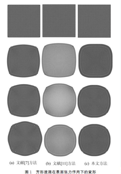 分別用文獻方法、文獻方法及本文方法模擬在表面張力作用下水珠的形成過程,對比它們的模擬效果,如圖1所示。圖1方形液滴在表面張力作用下的變形341第1期汪歡歡,等:改進的CSF流體表面張力模型實驗在Window7平臺上進行,采用Visual Studio2013。實驗環境為Intel(R)Core(TM) i5G2400,3.10GHzCPU,4G內存,NVIDIA GeG forceGT620顯卡,實驗所采用的流體粒子數目為1024。模擬總幀數為500,文獻方法、文獻方法及本文方法分別用時9.12、9.87、9.34s。從實驗結果可以看出,本文方法與文獻方法、文獻方法的模擬時間差異很小,但本文方法模擬的水珠達到穩定狀態時表面更加圓滑,這說明本文方法可以更準確、有效地模擬流體表面張力。