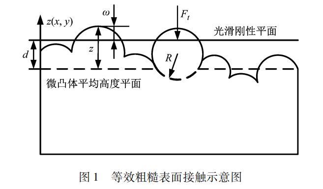 將兩隨機(jī)粗糙表面的接觸簡(jiǎn)化為一等效粗糙表面與光滑剛性平面的接觸,如圖1所示。圖1中,d為剛性平面到微凸體平均高度平面的距離;z為微凸體的高度;R為微凸體的半徑;Ft為法向載荷。