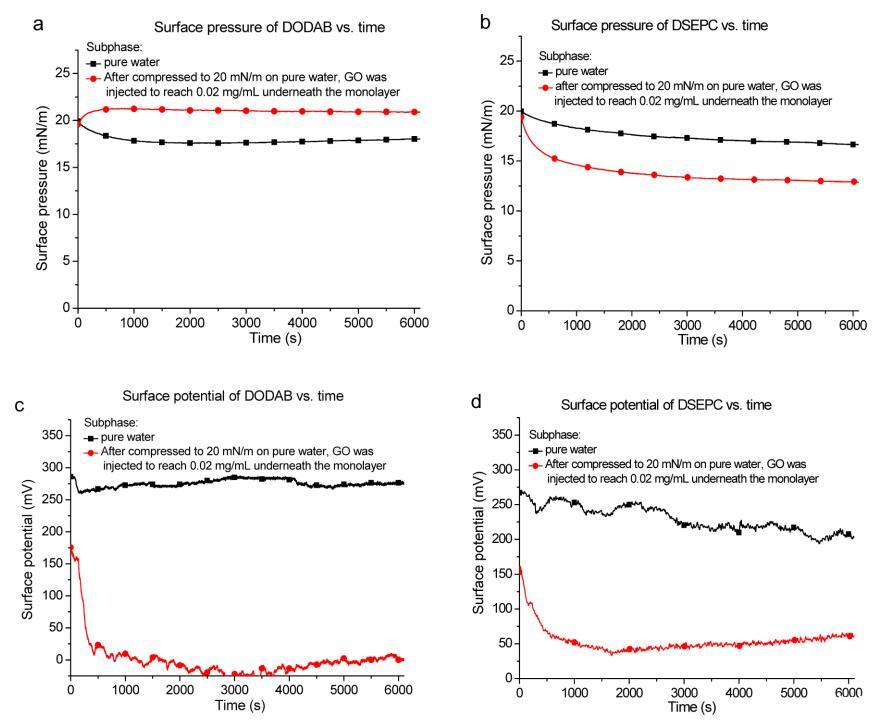 圖 2. (a) DODAB 和 (b) DSEPC 單層的表面壓力與經過時間的關系。 單層的表面電位與經過時間的關系 (c) DODAB 和 (d) DSEPC。 黑色曲線:單層在純水亞相上被壓縮到 20 mN/m 的表面壓力。 紅色曲線: 將單層壓縮至 20 mN/m 后,將 600 μL 1 mg/mL GO 分散體小心緩慢注入單層下方 進入水亞相以達到 0.02 mg/mL 的 GO。
