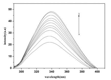 圖 3. 不存在和存在 16-E2-16 時(shí) Hb (5 μM) 的熒光光譜。 這 16-E2-16 (ak) 的濃度為 0, 0.39, 0.76, 1.13, 1.48, 1.81, 2.14, 2.45, 2.75, 3.05 和 3.33 μM。
