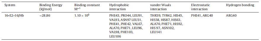 Hb 中的 α 和 β 鏈具有相似的結(jié)構(gòu)折疊, 由七個(gè)連續(xù)的α-螺旋和兩條鏈組成 包含由螺旋 4 和 5 包圍的間隙結(jié)合袋,而空腔的底部由 C 端部分形成 螺旋 6 和螺旋 7 的 N 端片段 [69]。 16-E2-16為主 Hb 與中央空腔、α1 和 β2 鏈結(jié)合(圖 6A)。 這 該結(jié)合位點(diǎn)上的氨基酸殘基包括 Thr39, α1 中的 Tyr42、Phe43、Pro44、His45、His58、His87、Leu91、Val93、Asn97 鏈和 Leu31、Arg40、Phe41、Phe42、His63、Val67、Ala70、Phe71、 His92, Leu96, His 97, Val98, Asn102, Phe103, Leu106, Leu141 in β2 鏈圖 6B。 有超過 20 個(gè)氨基酸殘基位于 16-E2-16 的站點(diǎn),這意味著它們之間的強(qiáng)相互作用 16-E2-16 和 Hb [70]。 疏水性和靜電力作用 在 16-E2-16 與 Hb 的結(jié)合中起重要作用,這個(gè)結(jié)果是 與我們的實(shí)驗(yàn)結(jié)果一致。 然而,范德瓦爾斯 力量不容忽視。 已觀察到一個(gè)氫鍵 在 16-E2-16/Hb 相互作用中的 16-E2-O 原子 具有 β2 鏈 ARG40 的 16 個(gè)分子(圖 6C)。 的形成 氫鍵穩(wěn)定 16-E2-16/Hb 復(fù)合物。 的類型 相互作用和參與相互作用的氨基酸殘基 以表格形式顯示(表 3)。