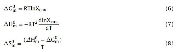 其中αG0m、αH0m和αS0m是自由能、焓的變化 和膠束化熵,Xcmc 是 cmc 處的摩爾分?jǐn)?shù)。 這 從方程 (6-8) 獲得的值顯示在表 2 中。