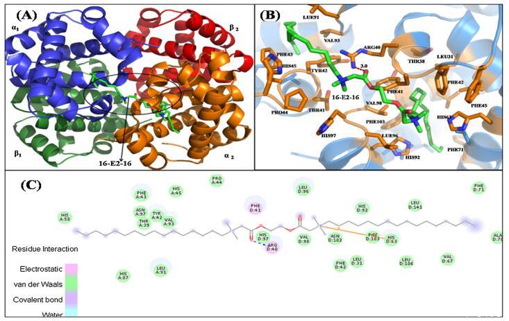 圖 6. 具有 16-E2-16 的 Hb 結(jié)構(gòu)示意圖。 (A) Hb-16-E2-16 的結(jié)構(gòu)。 Hb 的亞單位用不同的顏色表示。 配體 16-E2-16 是 以棍子為代表。 (B) 距停靠的 16-E2-16(綠色)5? 范圍內(nèi) Hb 的周圍氨基酸殘基(橙色)。 (C) Hb/16-E2-16 相互作用的二維表示。 (為了 對(duì)圖例中顏色參考的解釋,讀者可參考本文的網(wǎng)絡(luò)版本。)