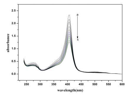 圖 2. 不存在和存在 16-E2-16 時(shí) Hb (5 μM) 的紫外-可見光譜。 這 16-E2-16 (am) 的濃度為 0, 0.39, 0.76, 1.13, 1.48, 1.81, 2.14, 2.45, 2.75, 3.05 和 3.33 μM。