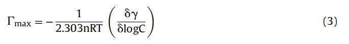 最大表面過量 (∫max) 表示為每單位面積界面處的表面活性劑分子濃度。 表面張力數(shù)據(jù)用于計(jì)算表面過量 應(yīng)用吉布斯吸附等溫線的濃度 (∫max) 方程: