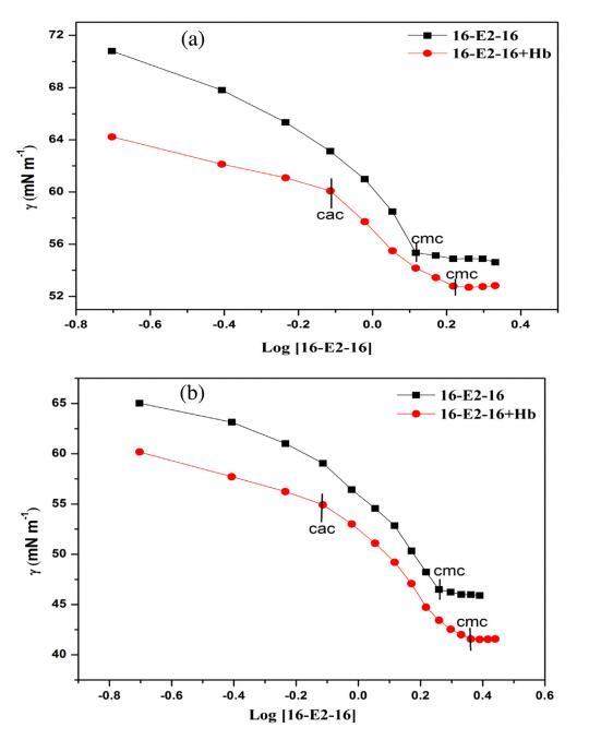 表面張力測量用于研究 關(guān)于 16-E2-16/Hb 相互作用的定性信息 空氣/水界面。 圖 1 顯示了 16-E2-16 分布的表面張力與對(duì)數(shù)濃度在不存在和 在不同溫度下存在 Hb (5 μM)。 斷點(diǎn) 表面張力與表面活性劑濃度對(duì)數(shù)的關(guān)系 不同溫度下純表面活性劑的文件對(duì)應(yīng) 到相應(yīng)溫度下表面活性劑的 cmc。 這 16-E2-16/Hb體系的表面張力曲線呈現(xiàn)兩個(gè)斷裂 點(diǎn),第一個(gè)斷點(diǎn)對(duì)應(yīng)臨界聚合 濃度(cac)代表表面活性劑的開始 蛋白質(zhì)結(jié)合而作為第二個(gè)斷點(diǎn)對(duì)應(yīng)于 在 Hb 存在下 16-E2-16 的 cmc。 16-E2-16 的 cmc 在不同溫度下不存在和存在 Hb 的情況下 列在表 1 中。從這些值可以看出,16-E2-16 的 cmc 隨著 Hb 的存在和溫度升高而增加。 在 Hb 存在下 cmc 的增加證實(shí)了 16-E2-16/Hb 復(fù)合物的形成,在此期間一些單體 與 Hb 結(jié)合,因此無法形成膠束 進(jìn)而導(dǎo)致膠束化延遲 [54]。 表1還 表明 cmc 值隨溫度升高而增加 這意味著疏水力的參與,它們是 溫度依賴,在 cmc 的蛋白質(zhì)表面活性劑相互作用中。 這可以歸因于 16-E2-的溶解度增加 16 單體隨溫度變化而抑制膠束化。 此外,較高的溫度有利于熱運(yùn)動(dòng),這會(huì)導(dǎo)致 更多的分子與 Hb 結(jié)合。 但是,cac 保持不變 在所有溫度下。 因此,我們可以認(rèn)為 16-E2-16 與 Hb 結(jié)合 通過 cac 附近的靜電相互作用,因?yàn)殪o電 相互作用不受溫度影響。 此后,作為 表面活性劑濃度增加,蛋白質(zhì)通過疏水力與表面活性劑相互作用。 下表面張力值 Hb-16-E2-16系統(tǒng)比對(duì)應(yīng)的16-E2-16系統(tǒng)是 由于 Hb 的高表面活性。