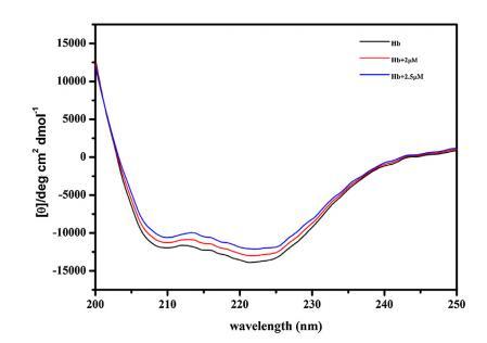 圖 5. 不存在和存在 16-E2-16 時(shí) Hb (5 μM) 的 CD 光譜。